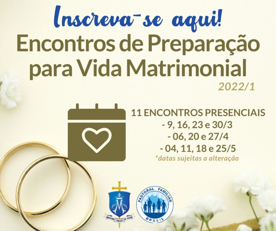 A Pastoral Familiar abre inscrições para os Encontros de Preparação para a Vida Matrimonial (EPVM) do primeiro semestre de 2022, que se realizarão de 9 de março a 25 de maio.