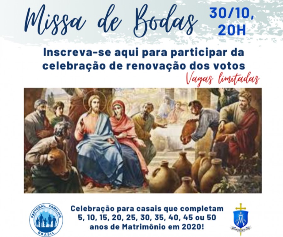 A Pastoral Familiar organiza uma Missa de Bodas para renovação de votos para casais que completam 5, 10, 15, 20, 25, 30, 35, 40, 45 e 50 anos de matrimônio no ano de 2020. A celebração está marcada para o dia 30 de outubro, às 20h.
