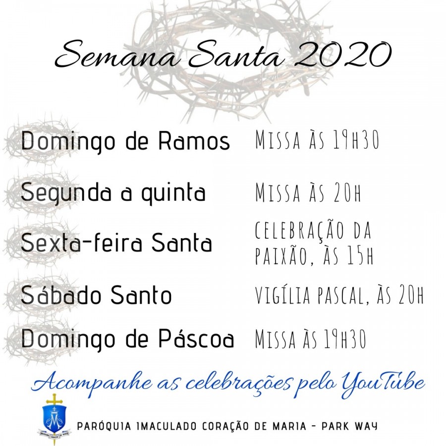 Por causa da pandemia e das recomendações para que não tenhamos aglomeração, nossa Paróquia disponibiliza a programação online para que vivamos em contrição e oração a Semana Santa.